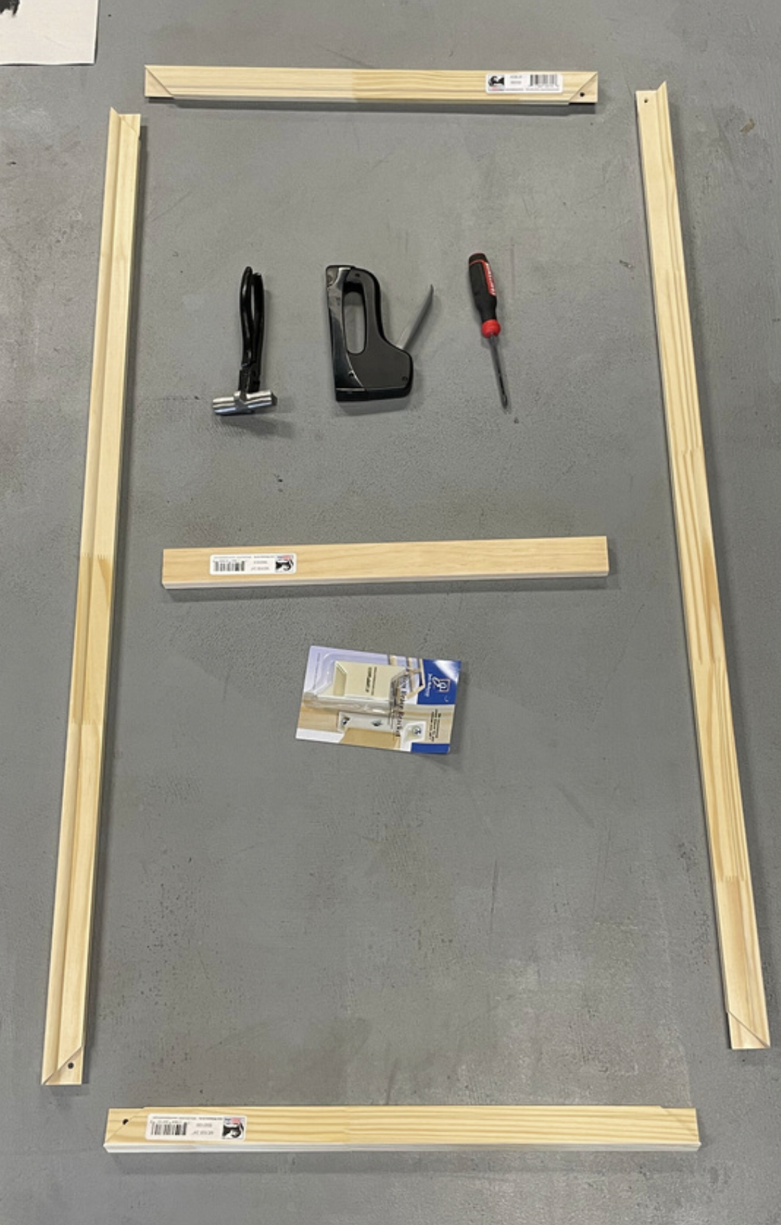To build your own canvas you will need: canvas cloth, stretcher bars, canvas pliers & a staple gun. Additionally you may need a pen, ruler or measurement tape, staple remover & scissors.